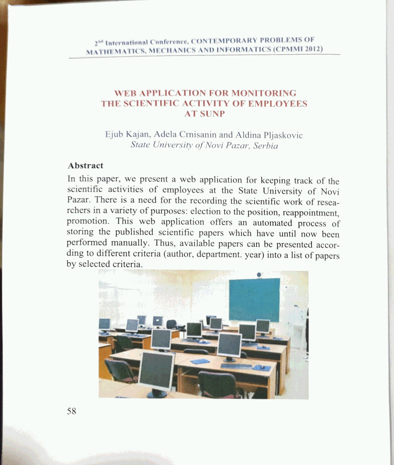- Ejub Kajan, Adela Crnišanin, Aldina Pljasković, Web Application for Monitoring the Scientic Activity of Employees at Sunp, 2th International Conference Contemporary Problems of Mathematics, Mechanics and Informatics, 2012, Novi Pazar, 58. M32