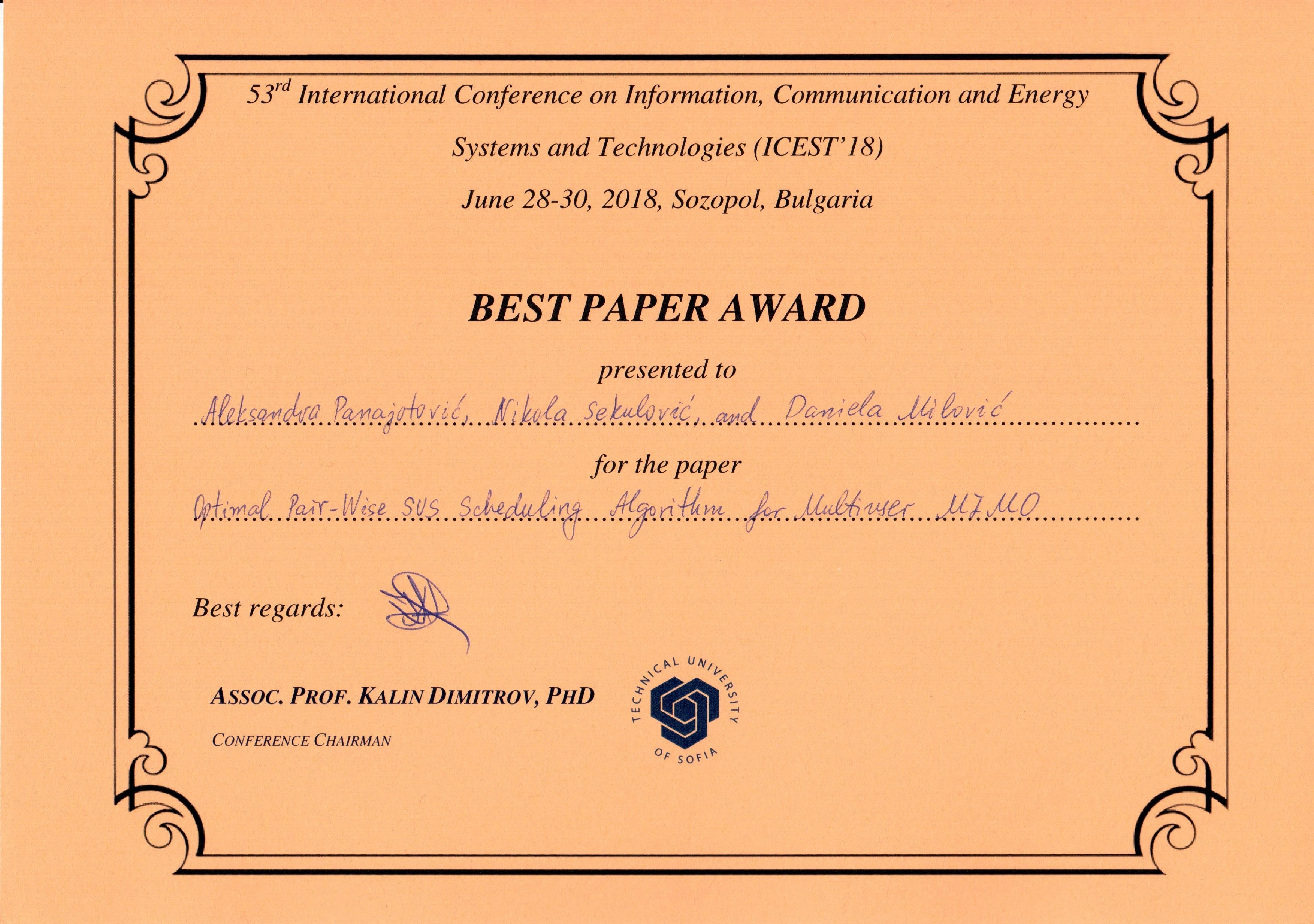 42. Aleksandra Panajotović, Nikola Sekulović, Daniela Milović, „Optimal Pair-wise SUS Scheduling Algorithm for Multiuser MIMO“, Proceedings of 53nd International Scientific Conference on Information, Communication and Energy Systems and Technologies - ICEST 2018, Technical University of Sofia, pp. 179-182, 28-30 Jun. 2018, Sozopol, Bulgaria, 2018, ISSN:2603-3259. (M33)